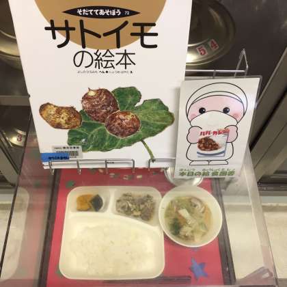 写真中央は、本日の献立サンプルと、給食図書です。本日の給食図書は「サトイモの絵本」でした。いろいろな種類のさといもや、葉の軸の部分であるずいきの食べ方等が載った、絵本の図書でした。