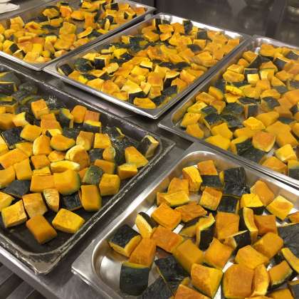 焼きかぼちゃは、塩をふった冷凍のかぼちゃを、焼き物機で蒸し焼きにした、焼き物献立でした。本日は1年で最も日が短い冬至です。冬至の日はかぼちゃ(なんきん)を食べる風習があります。