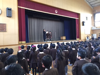 講堂では、全学年で大阪市歌を斉唱した後、初めに大阪市小学校児童絵画・版画展で賞をもらった3年生と5年生児童の表彰がありました。校長先生からは「3学期が始まりました。短い学期ですが、次の学年に向けてしっかりまとめをしましょう。自分の顔を鏡に映して見ているつもりで、自分自身が友だちになりたいな思うような人になりましょう。」というお話がありました。