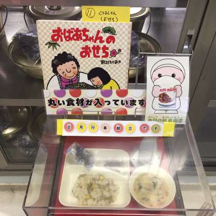写真中央は、本日の献立サンプルと、給食図書です。本日の給食図書は「おばあちゃんのおせち」でした。おばあちゃんと孫のきりちゃんが一緒におせち料理を作る絵本でした。