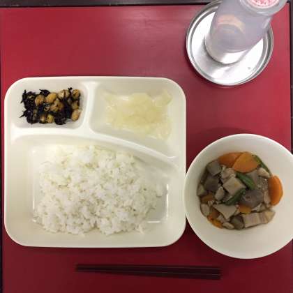 本日の献立は「筑前煮・ひじき豆・だいこんのゆず風味・ごはん・牛乳」でした。