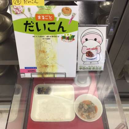写真中央は、本日の献立サンプルと、給食図書です。本日の給食図書は「まるごと だいこん」でした。世界のいろいろな種類のだいこんや、育て方等が載っている絵本でした。
