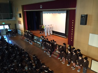 まず、日頃給食を作ってくれている給食調理員さんへ、感謝の手紙を渡し、その後、クイズ「何を作っているでしょうか?」をやりました。「とうふハンバーグ」ができていく工程が映像で流れ、ひとつひとつ捏ねて作られている様子を観ました。また、映像が流れている間は、給食委員が舞台の左右に並んで、音楽に合わせてダンスをしました。そして最後に、給食調理員さんから「これからも鶴見南の児童の為に、美味しい給食を作っていきます。」という挨拶をもらいました。この集会を通して、自分達が食べている給食により興味を持てるといいですね。