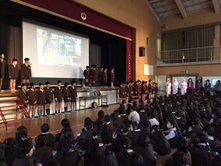 今週は全国学校給食週間なので、本日の児童集会は、給食委員会が給食についての集会をしました。
