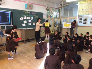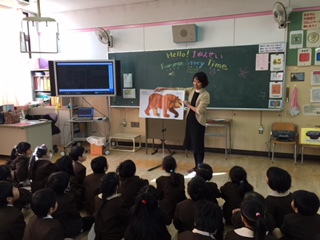 また、今日は1年生のTST(鶴南ストーリータイム)がありました。講師の赤松先生は朝のTETの様子を見て「鶴見南は1年生から楽しく英語を話したり歌ったりしているのが素晴らしいですね」と言われていましたが、TSTが始まってもそれは続いていました。今日は金村先生と初めに"Colors I like"を歌って、色の英語の言い方を学習しました。次にカラーセロハンを使って、色を混ぜたらどうなるかを考えました。Red+Green=Brownから今日のお話"Brown Bear,Brown Bear,What do you see?"につながりました。1年生の子どもたちは、金村先生の英語の読み聞かせを聞きながら、動物や色の名前について楽しく学習しました。