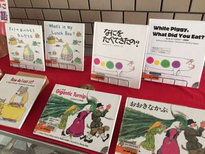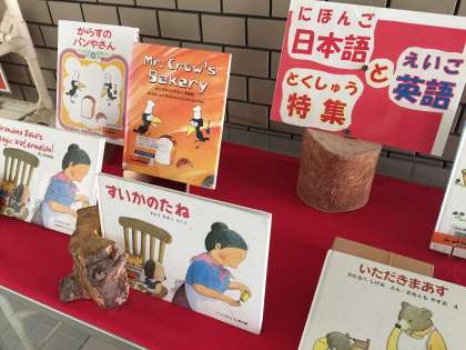 食育に関する図書を1ヶ月ごとにテーマを変えて玄関に設置しています。今月のテーマは「日本語と英語」です。
