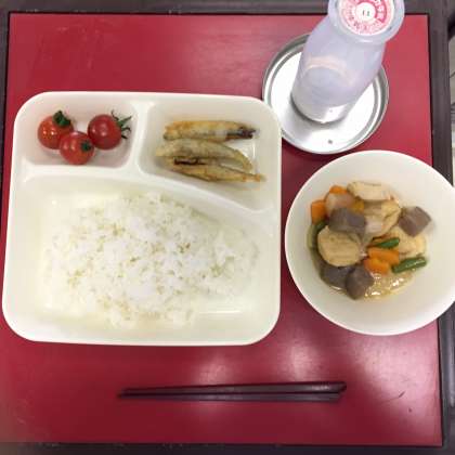 本日の献立は「きびなごてんぷら・一口がんもとだいこんの煮もの・プチトマト・ごはん・牛乳」でした。