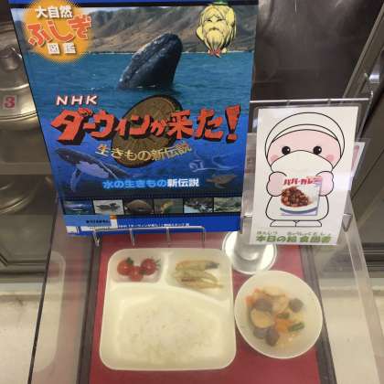 写真中央は、本日の献立サンプルと、給食図書です。本日の給食図書は「ダーウィンが来た!」でした。