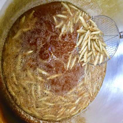 きびなごてんぷらは、冷凍のてんぷらを熱した油で揚げた、揚げ物献立でした。本日のてんぷらは衣に卵を使用していない、てんぷらでした。