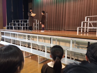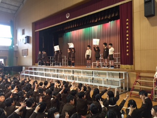2月6日(日)全校朝会を講堂で行い、初めに「子どもエコ俳句大賞」で優秀賞になった3年生の表彰がありました。きれいな海をいつまでも大切にしたいという気持ちで「さおにぎり つっぱる糸と そ父のあせ」という句を作ったそうです。