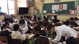 2年生で「歯みがき指導」があり、歯科校医先生と大阪市教育委員会から来ていただいた歯科衛生士さんが、子どもたちに正しい歯みがきのしかたを教えてくださいました。初めに歯みがきが十分できていないところを染め出して手鏡で見てみると、子どもたちはビックリ! きちんと歯みがきをしようという気持ちになったようです。今日から実践してほしいですね。
