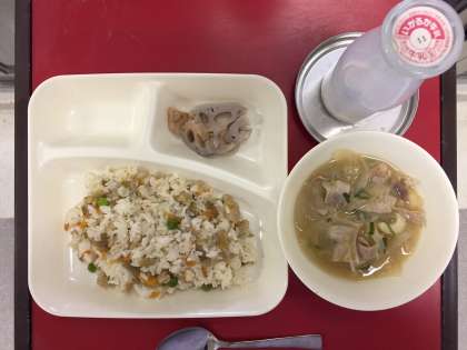 本日の献立は「鶏ごぼうご飯・みそ汁・焼きれんこん・牛乳」でした。