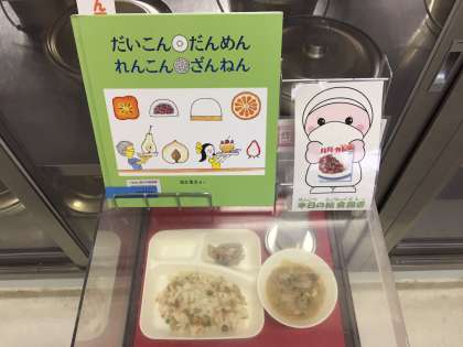 写真中央は、本日の献立サンプルと、給食図書です。本日の給食図書は「だいこん だんめん れんこん ざんねん」でした。