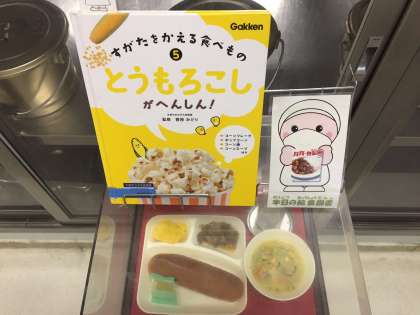 写真中央は、本日の献立サンプルと、給食図書です。本日の給食図書は「とうもろこしがへんしん!」でした。とうもろこしからコーンフレークやポップコーン等が作られる様子が載っている図書でした。