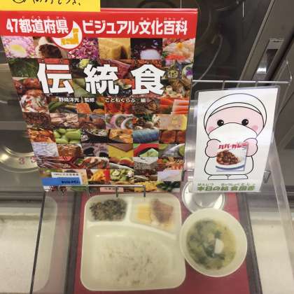 写真中央は、本日の献立サンプルと、給食図書です。本日の給食図書は「伝統食」でした。全国のさまざまな伝統食が、テーマ別や地域別に載っている図書でした。
