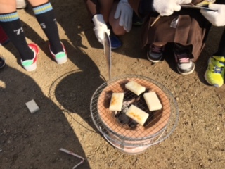 3年生は社会科「昔の道具体験」で、七輪で火をおこし、お餅を焼いて食べました。子どもたちは「七輪で火をおこすのは大変だったけど楽しかったし、お餅はとてもおいしかったです。」と言っていました。