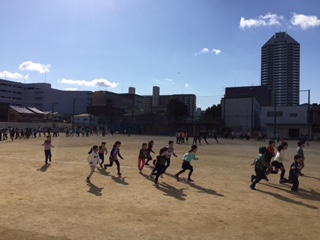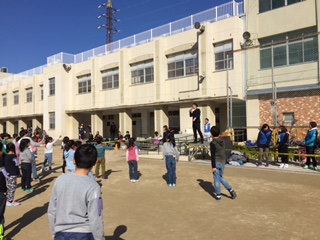 本校からは午前・午後合わせて約600名の参加申し込みがあり、保護者引率で鶴見小学校の運動場に集合しました。