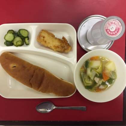 本日の献立は「いかてんぷら・スープ煮・あっさりきゅうり・パン・牛乳」でした。