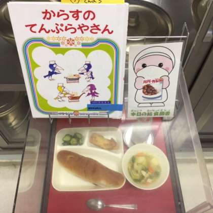 写真中央は、本日の献立サンプルと、給食図書です。本日の給食図書は「からすのてんぷらやさん」でした。火事でお店が焼けてしまい落ち込むてんぷら屋さんを励ます、からすのパン屋さんの子ども「レモンちゃん」のお話でした。