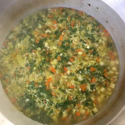 スープ煮は、オリーブ油でにんにく、鶏肉、にんじん、キャベツを炒めてから、チキンスープで煮て、じゃがいも、三度豆を加えて仕上げた、煮物献立でした。