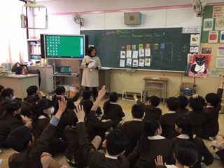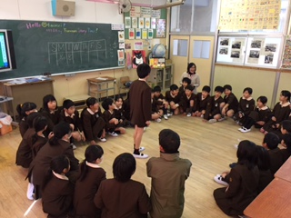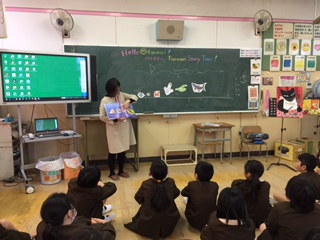 初めに曜日の英語の言い方を歌で練習して、フルーツバスケットのやり方で"Days Basket"のゲームをみんなで楽しみました。次に曜日の出てくるエリック・カールの絵本"Today is Monday"の読み聞かせを聞きました。4年生の子どもたちは、曜日・動物・食べ物の名前と順番をよく覚えていました。最後に「食物連鎖」に関する絵本で"A Hole in the Bottom of the Sea"の読み聞かせも聞きました。海の中の生き物が順番に食べられる話ですが、楽しい絵と歌で、子どもたちは英語のお話に親しみました。