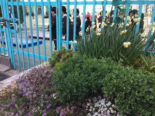 真ん中の写真は校門を入って右に咲いているスイセンです。良い香りを漂わせている向こう側では、なわとびをしている子どもたちがたくさんいます。
