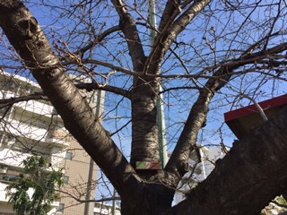 下の写真は、ウサギ小屋のところにあるサクラです。まだつぼみの前の芽の段階ですが、少しずつふくらんできています。