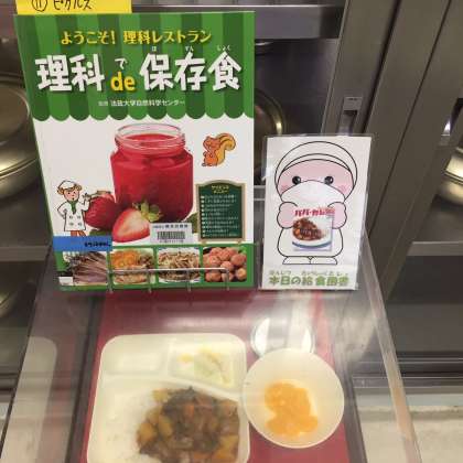 写真右は、本日の献立サンプルと、給食図書です。本日の給食図書は「理科で保存食」でした。