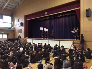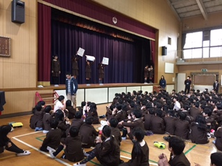 朝の児童集会は、講堂で集会委員会による「まちがいさがし」をしました。集会委員の「カーテン」というかけ声で、縦割りのなかよし班が声を合わせて「オープン」と言います。1回目に集会委員がしているポーズと、2回目のポーズで変わったところを見つけて、三択問題に答えます。鬼に豆を投げていた人が二回目には鬼に豆を投げられていたり、男の子にプレゼントを渡そうとしている女の子の場所が入れ替わっていたりする楽しいポーズに、みんな大笑いしながら集会を楽しみました。