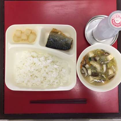 本日の献立は「さばの塩焼き・五目汁・だいこんのみそ煮・ごはん・牛乳」でした。