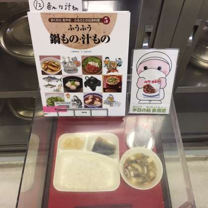 写真中央は、本日の献立サンプルと、給食図書です。本日の給食図書は「鍋もの・汁もの」でした。全国のいろいろな鍋ものや汁ものが載っている図書でした。