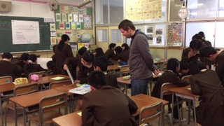 4〜5人のグループで"Peach Boy"(桃太郎)をもとに、キャラクターや場面を工夫し、これまでに学習した英語のセリフを使って、紙芝居形式で発表しました。キャラクターにはいろいろな食べ物や、テレビやアニメの主人公、芸能人が登場し、楽しいストーリーを考えて絵を描きました。