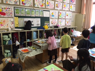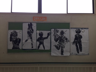 上の写真は1年生の「えのぐをつかったかたちから」で、カラフルな色で刷るところです。真ん中の写真は2年生の紙版画「○○をしている自分」です。2枚分の紙から飛び出しそうなダイナミック動きです。下の写真は3年生のスチレン版画で「わたしのすきなお話」というテーマです。どれも子どもたちの、楽しく表現している気持ちが伝わってきますね。
