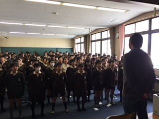 2時間目と4時間目には、5年生と6年生がそれぞれC-NETのBarry先生との「フェアウェル・パーティー」をしました。初めに代表の人が英語であいさつをし、続けて各組からBarry先生に英語でクイズを出しました。次にBarry先生の故郷スコットランドの歌"The water is wide"を歌いながら一人ずつ英語で書いたカードを手渡しました。Barry先生からは「13年間、日本で英語を教えてきましたが、こんなに嬉しかったことはありません。あなたがたは、最高の5,6年生です。6年生、中学生になってもがんばってください」と英語でメッセージがありました。ここでも小さな国際交流が進みました。