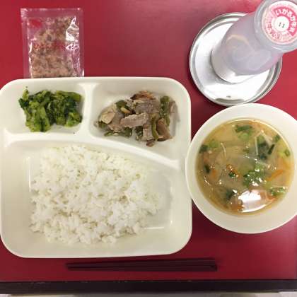 本日の献立は「豚肉のごまだれ焼き・みそ汁・菜の花のおひたし・ごはん・牛乳」でした。