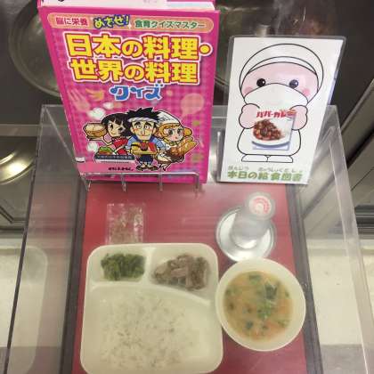 写真中央は、本日の献立サンプルと、給食図書です。本日の給食図書は「日本の料理・世界の料理クイズ」でした。野菜やくだものの産地を当てるクイズや、どこの国の料理かを当てるクイズ等が載っている図書でした。