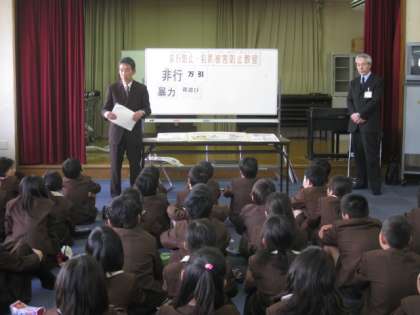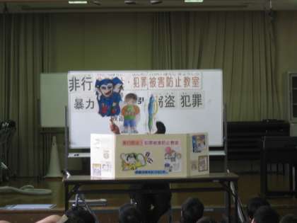 次にペープサートを見ながら「もし万引きをしたらどうなるか」というお話を聞きました。コンビニでシャープペンシルを万引きして店員に呼び止められ、警察と家族に連絡されるという場面でした。家族の人はとても悲しむし、万引きは犯罪への入り口となるので絶対にしてはいけませんというお話でした。