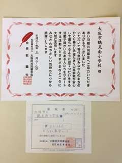 学校に、大阪府共同募金会から「赤い羽根共同募金」のお礼が届きました。11月末〜12月初めに、児童会の人たちが募金箱を持って行った募金に、31,160円集まったそうです。このお金は、感謝状にあるように、高齢者や障がいのある方のサポートに活用されるということです。皆さんの善意が届いて良かったですね。