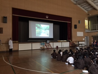 今日はこの後、幼虫に名前を付けて家に持ち帰ります。段ボール箱等で覆いをして、夜に開けると光っているのが見られるそうです。5年生は家族の人と楽しんでみてください。
