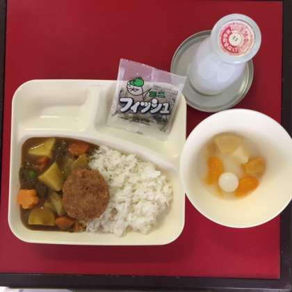 4月12日(水)の給食献立をお知らせします。本日の献立は入学祝い献立で、「カツカレーライス・フルーツ白玉・ミニフィッシュ・牛乳」でした。