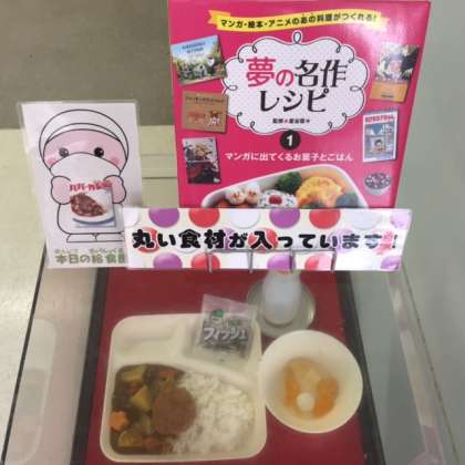 写真中央は、本日の献立と給食図書です。本日の給食図書は「夢の名作レシピ」でした。絵本やマンガに登場する料理の作り方が載っている図書でした。「3月のライオン」の「冷やし白玉シロップ」のレシピ等が載っていました。