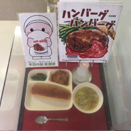 写真中央は、本日の献立と給食図書です。本日の給食図書は「ハンバーグ ハンバーグ」でした。ハンバーグを作る工程が、絵でわかりやすく描かれた絵本でした。