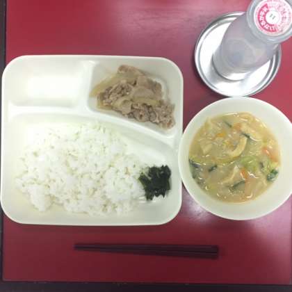 本日の献立は「豚肉のしょうが焼き・みそ汁・じゃこわかめ・ごはん・牛乳」でした。