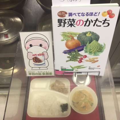 写真中央は、本日の献立と給食図書です。本日の給食図書は「野菜のかたち」でした。たまねぎやにんじん、しょうが等の野菜が、絵で説明されている図書でした。
