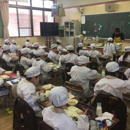 写真右は、1年生が給食を食べている様子です。