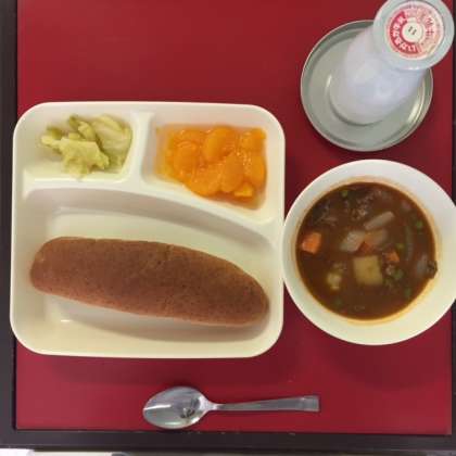 本日の献立は「ビーフシチュー・キャベツのピクルス・みかん(缶)・パン・牛乳」でした。