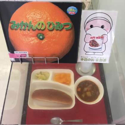 写真中央は、本日の献立と給食図書です。本日の給食図書は、「みかんのひみつ」でした。みかんの成長の様子や、たくさんの種類のみかんが載っている図書でした。