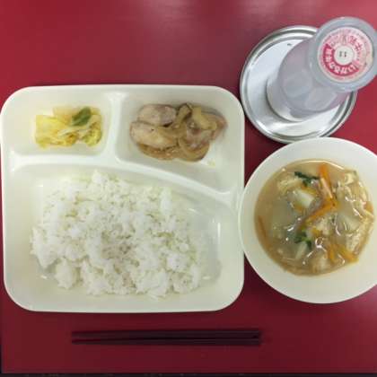 本日の献立は「鶏肉の甘辛焼き・みそ汁・キャベツの梅風味・ごはん・牛乳」でした。