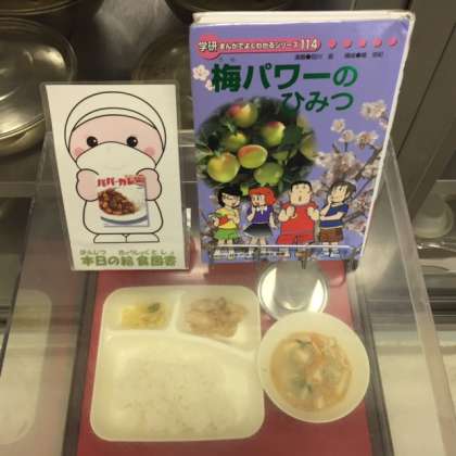 写真中央は、本日の献立と給食図書です。本日の給食図書は、「梅パワーのひみつ」でした。梅干しの作り方や梅の栄養等が載っている図書でした。