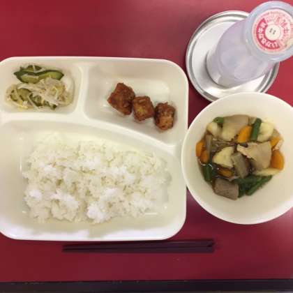 本日の献立は「まぐろのオーロラ煮・じゃがいもと野菜の含め煮・きゅうりともやしのゆずの香あえ・ごはん・牛乳」でした。